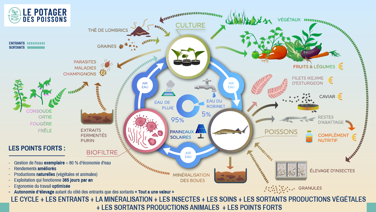 Infographie du cycle de production de la ferme aquaponique Le Potager des Poissons.