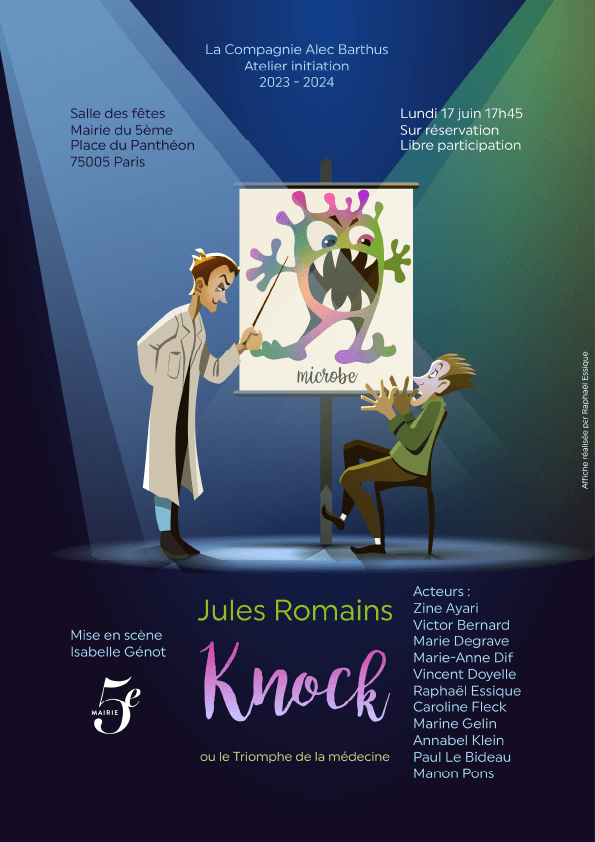 Affiche de la pièce de théâtre Knock ou le Triomphe de la médecine de Jules Romains, jouée le 17 juin 2024 à la mairie du 5ème arrondissement de Paris.